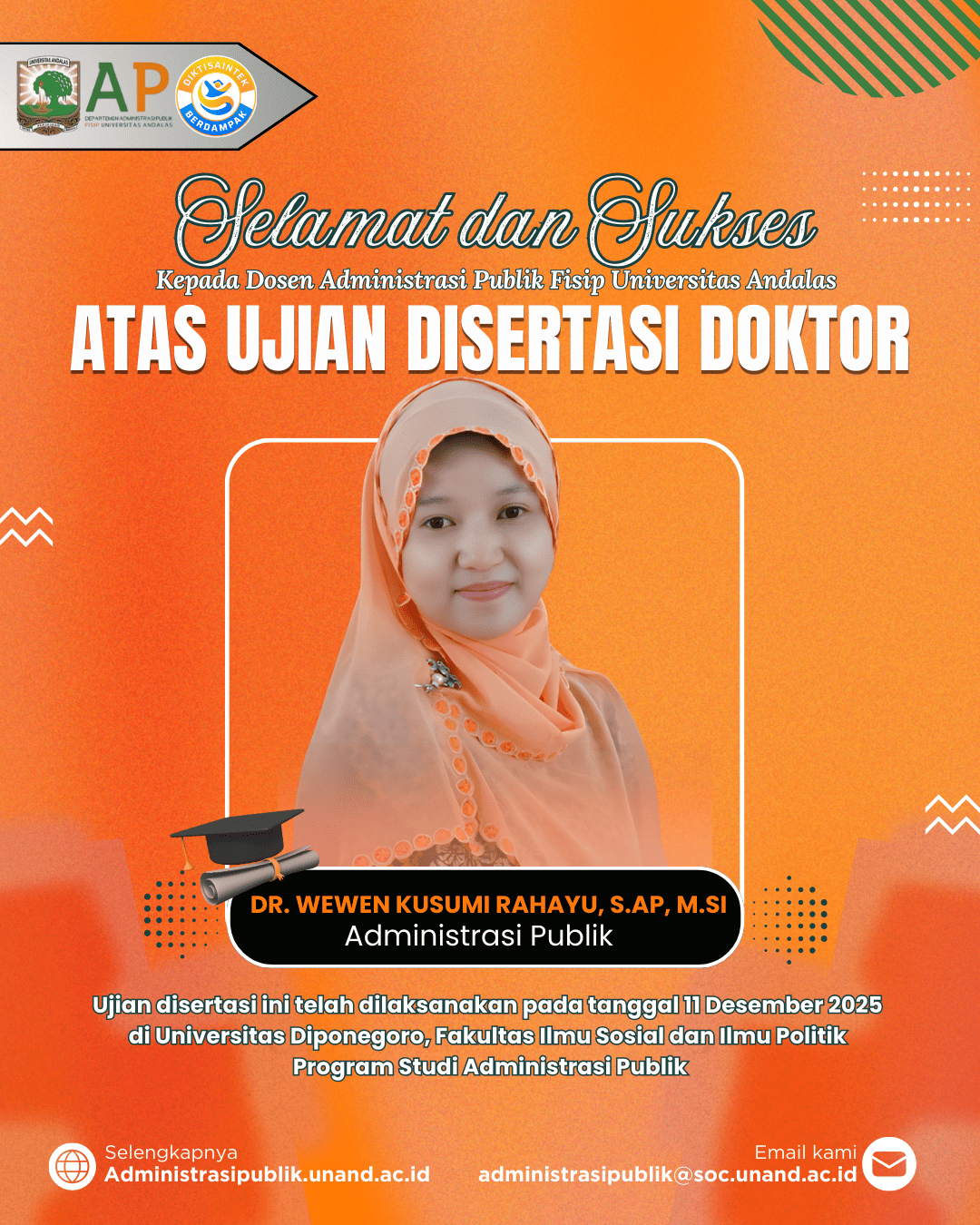 Dosen Administrasi Publik FISIP Universitas Andalas, Selamat dan Sukses Atas Ujian Disertasi Wewen Kusumi Rahayu S.AP., M.Si. Raih Gelar Doktor pada 11 Desember 2025🎓