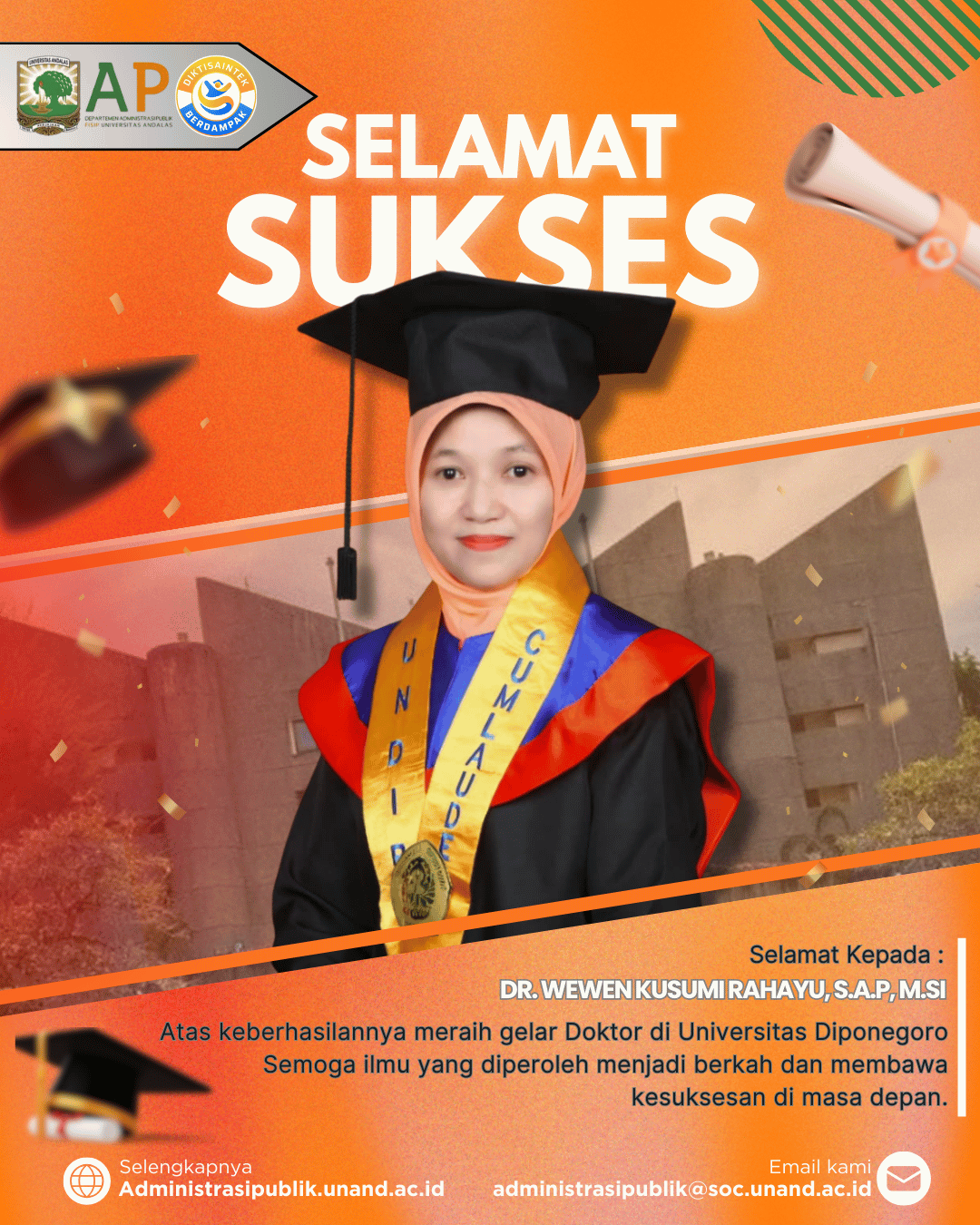 Selamat dan Sukses Wisuda Dr. Wewen Kusumi Rahayu, S.A.P., M.Si atas Capaian Akademik Lulusan Doktor Administrasi Publik Universitas Diponegoro🎓